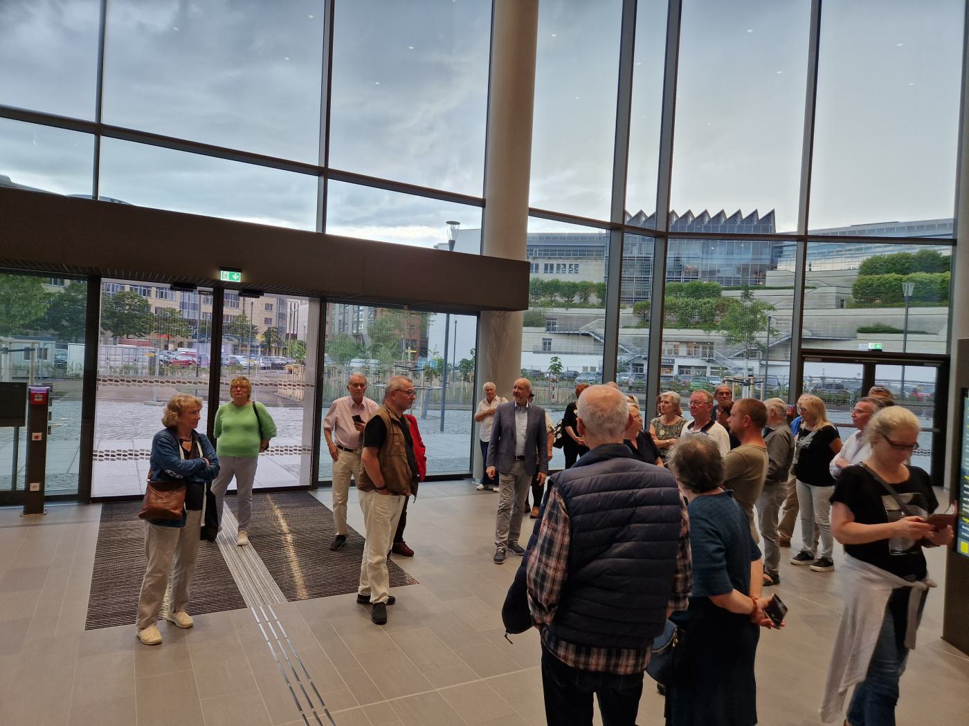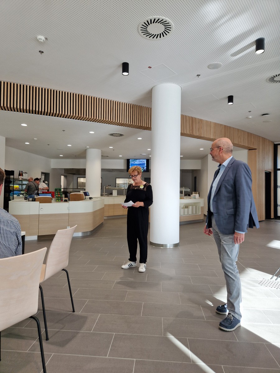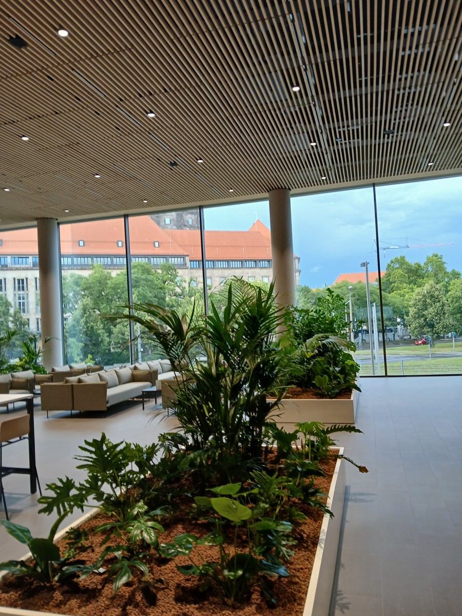 Alle lauschten interessiert den Ausführungen unserer Vorsitzenden, Frau Inka Hüning und freuten sich über die anschließende Führung durch den Geschäftsführer der KID. Dieser Bau ist gigantisch: Hohe, lichte Räume, großzügige Arbeitsplätze. Wenn man den ganzen Tag am Computer sitzt, tut irgendwann das Kreuze weh, deshalb gibt es reichhaltige Rückzugsorte in verschiedenen Variationen für die rund 1000 Angestellten. Die Pausenversorgungen und das Café können auch von den Dresdnern genutzt werden. So ist es endlich wieder möglich, ab 8.00 Uhr zu frühstücken, Mittag gibt es bis 14.00 Uhr und das Café kann bis 18.00 Uhr genutzt werden.